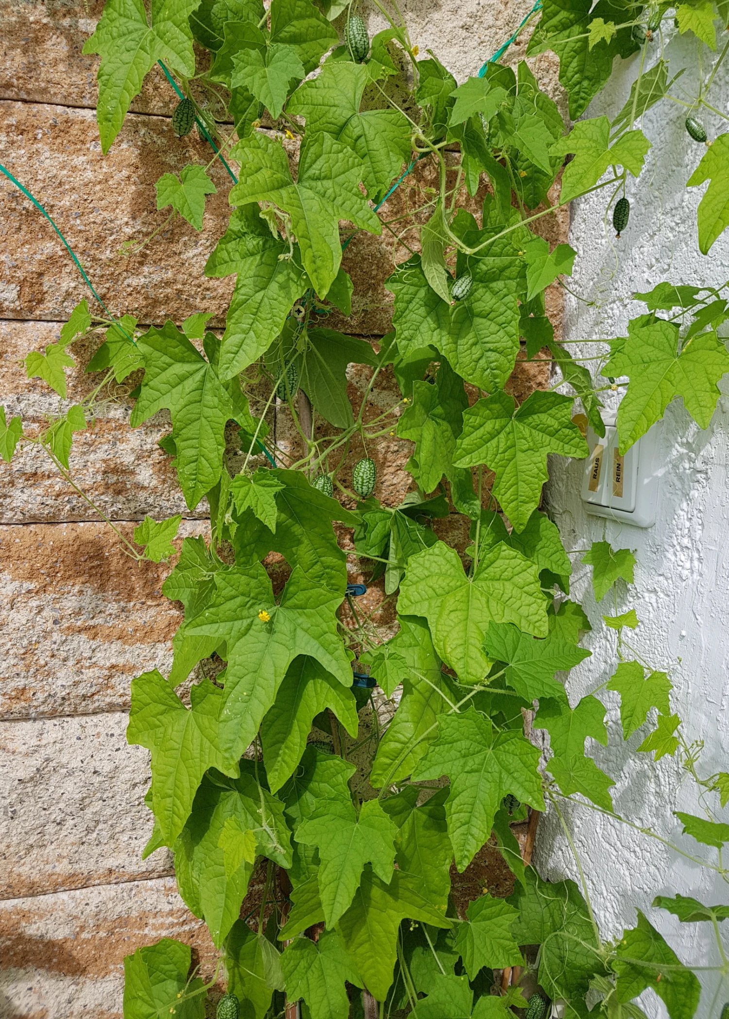 Mouse Melon vines grow from 8 to 10 feet long and have a similar growth habit to cucumbers. They will quickly cover a wall or trellis or can be used as container plants or in hanging pots. Their yellow flowers bloom in the spring and summer and produce one-inch-long green fruits with dark green longitudinal stripes from midsummer through fall.